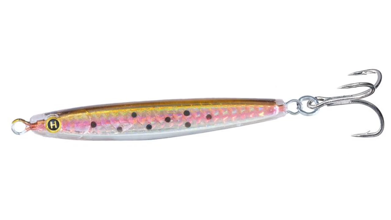 The Hogy Epoxy Jig features a vivid scale finish core surrounded by a double coat of epoxy for excellent durability and natural refraction of light, and a thru-wired body. Perfect for predators that relay heavily on their sight, such as False Albacore and Tuna. Comes rigged with a VMC 4x Permasteel Treble, and a stainless steel split ring. The lure is 4in long. Please note: All lures have an “H” in the eye.