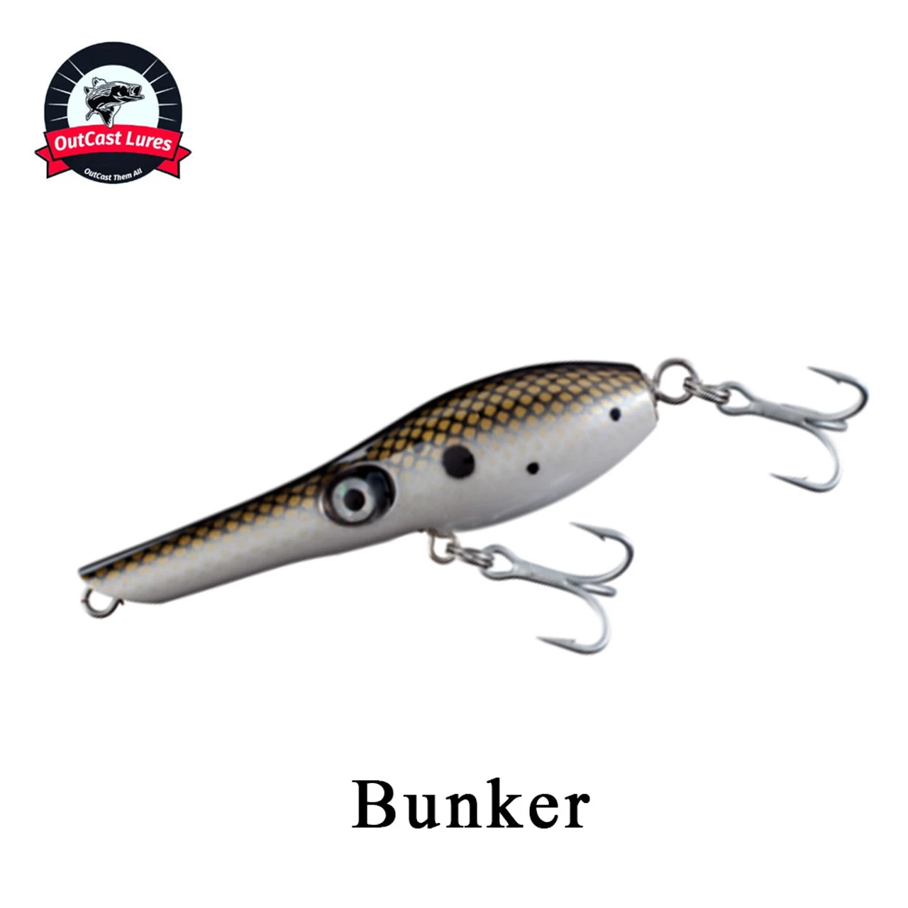 Drawing inspiration from the design of OutCast’s regular pencil and polaris popper, these pencils feature an extremely aerodynamic tail. Weighing around 4+ oz (weight varies slightly), these plugs allow themselves to be flung further than other style of pencils on the market. These lures are 7.5″ long and come rigged with grade A gear with Rosco split rings and VMC treble hooks.